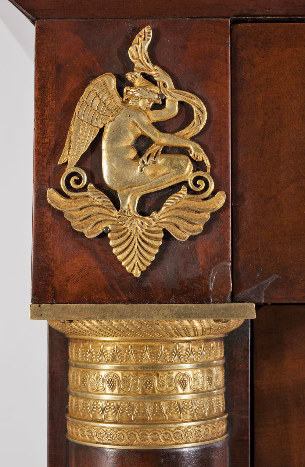 The secretary, now a gift to Historic New England, was probably commissioned soon after Appleton’s marriage in 1819 to Mary Lekain Gore, a widow twenty-three years younger. Examination by Robert Mussey and Clark Pearce has determined it was made by the firm of Isaac Vose and Joshua Coates, who also made furniture for Samuel’s brother, Nathan, at about the same time. Its discovery suggests the provenance of another piece attributed to that firm should be reconsidered: the pier table with its handsome specimen marble top in the Kaufman collection in the National Gallery in Washington (Fig. 4). Because that table was found in the house of Nathan Appleton’s daughter, Mrs. Greely Curtis, it was assumed she had inherited it from her father. But could it have belonged to Samuel instead and then given to his niece by Mary Appleton at some point as well? The curved shape of the base and the paw feet of the pier table depicted in the Edouart silhouette and, most significantly, the identical winged nymph mounts on Samuel’s secretary (Fig. 5) add credence to this conjecture. Perhaps one day another bit of serendipity will provide the answer.