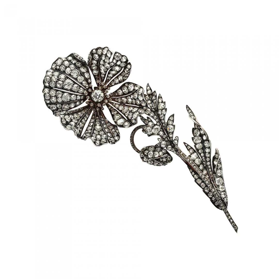 - Old-mine diamond floral spray brooch. Approximately 18 cts., set in silver and gold. English, ca. 1860. Offered by A La Vieille Russie, stand 110.
