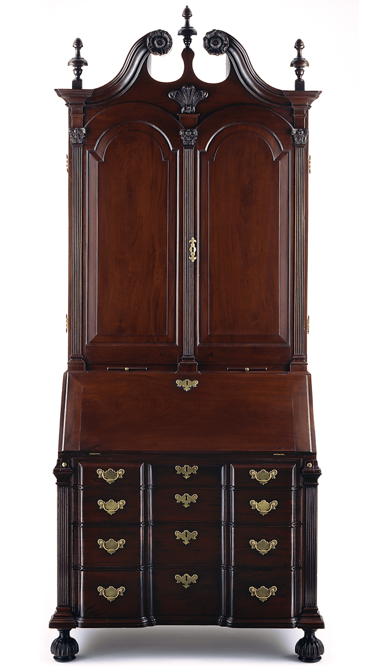 Desk and bookcase, ca. 1750, carving attributed to John Welch, Boston, Ma. Mahogany and white pine. Lent by the Chipstone Foundation. 1991.10. Photography by Gavin Ashworth.