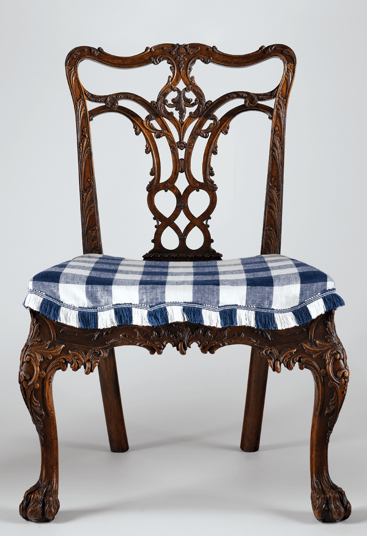 In the same year that English designer Thomas Chippendale published his influential design book, Gentleman and Cabinet-Maker’s Director, in which he praised the rococo style as “modern French taste,” French engraver and painter Charles-Nicolas Cochin published a scathing essay against the style. He found its “serpentine contours” and “sinuous forms” beyond logical reason. Cochin suggested that if French designers continued making Rococo-style objects, they should “serve up” this “ridiculous twisted merchandise” to “all provincials and foreigners” in order to “maintain the superiority of France.” Indeed, the French-inspired rococo style remained popular in England and its American colonies for twenty years after Cochin’s derisive critique. The chair seen here marks the height of rococo design in America. The back splat’s intertwined vines drape over boughs of deeply carved foliage, and the undulating front of the chair descends down to hairy animal feet.