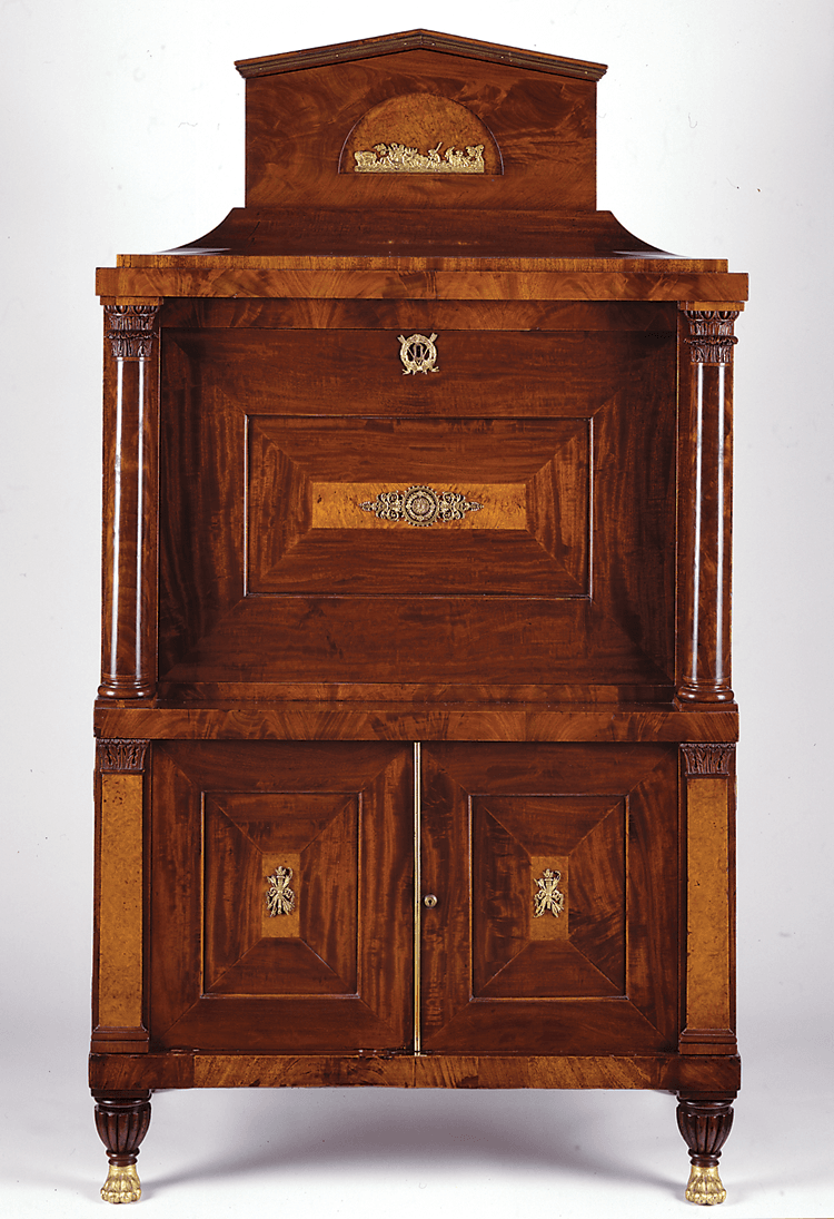 The art and architecture of ancient Greece and Rome have had a lasting influence on Western design. The obsession with classical decoration hit new heights in the early 1800s until some finally rebelled against it. Benjamin Silliman was a Yale University chemistry professor from a prominent family who published an illustrated report of everything he saw at the Exhibition of the Industry of All Nations held in New York City in 1853. Silliman criticized the furniture of the 1820s and 1830s shown at the exhibition for being slavish imitations of Greek temples and Roman monuments. The secretaire à abattant seen here, a French form that gained favor in America in the 1820s, is unmistakably rooted in classical architecture. Its thick columns and pilasters have meticulously carved capitals. The dark mahogany and light maple veneer create contrasting geometric shapes, a decorative device common in ancient architecture. The gilt appliqués on the lower doors feature torches, Roman symbols of liberty. Silliman preferred furniture more obviously suited to its intended use.