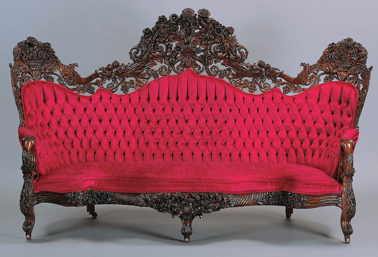 Sofa, ca. 1850, attributed to John Henry Belter (American, b. Germany, 1804–1863), New York, NY. Rosewood, rosewood laminate, and modern velvet upholstery. Milwaukee Art Museum, bequest of Mary Jane Rayniak in memory of Mr. and Mrs. Joseph G. Rayniak. M1987.16. Photography by Larry Sanders.