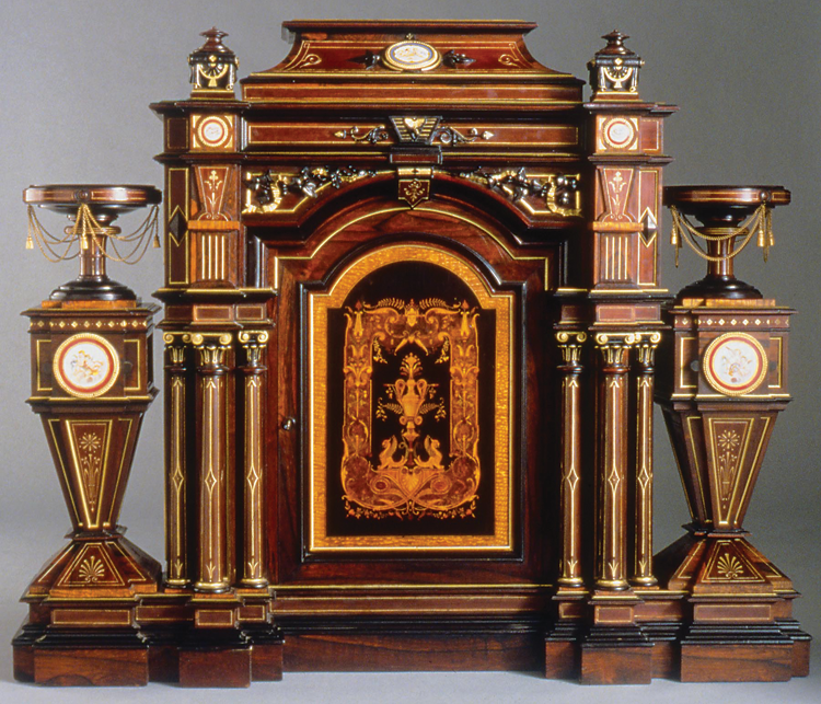 Parlor cabinet, 1860–1870, attributed to Alexander Roux (American, active 1847–1881), New York, NY. Wood with inlays, porcelain, gilding, and gilt metal. Milwaukee Art Museum; bequest of Mary Jane Rayniak, in memory of Mr. and Mrs. Joseph G. Rayniak, M1985.58. Photo Larry Sanders.