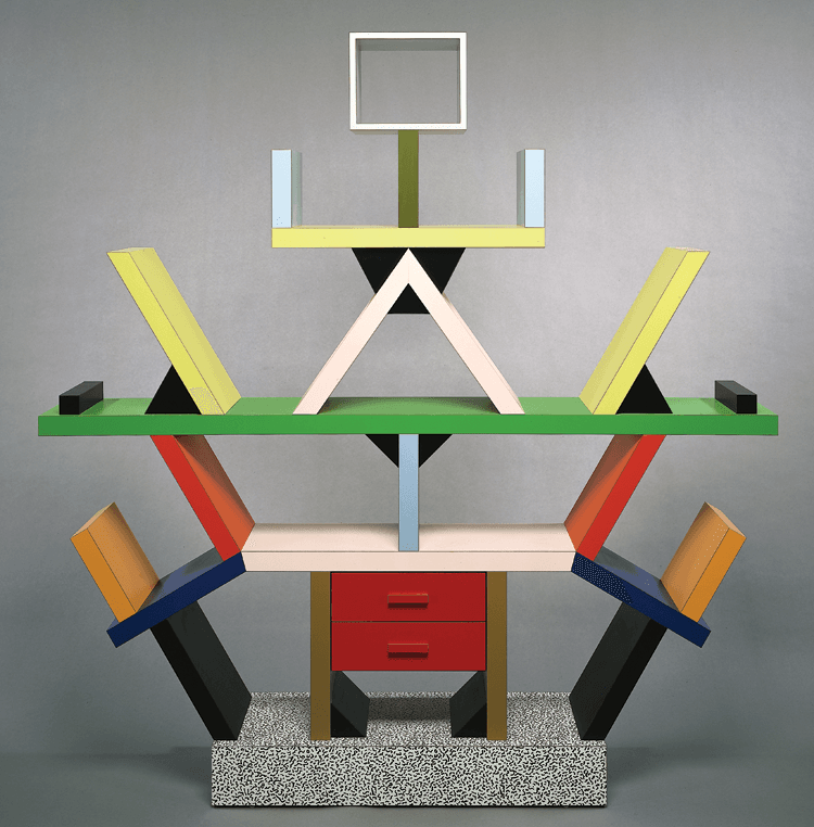 Italian designer Ettore Sottsass was a founding member of the Memphis design company, which got its name one evening in 1979 when he and a group of collaborators came up with new ideas to jolt the design world while listening to Bob Dylan’s album Memphis Blues Again. The group’s goal was to blur the lines between high art and popular culture by using bright colors, bold patterns, unconventional materials, and exaggerated shapes. For about five years, Memphis was extremely popular and challenged traditional ideas of “good taste” worldwide. By 1986, Sottsass had left the group. Unlike Thomas Chippendale and William Kent who championed a single style, Sottsass has worked in many different modes. He does not set out to create a particular “look” but, rather, to make a point. His tactic of using furniture to comment on the state of design is now seen as an early step in the postmodern movement, which continues to influence furniture styles today.
