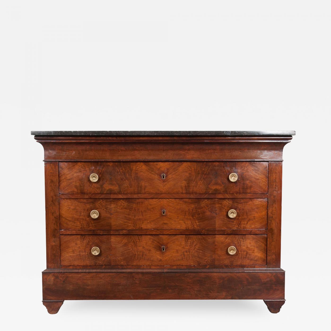 This dramatic and large Empire mahogany commode, with book-matched veneers, c.1810, is from France, and features a gorgeous black marble top with rounded corners, over a conforming case having a blind apron drawer, over three long drawers with excellent round ormolu pulls. The whole rests on a plinth base with shaped block feet. Lacking keys.