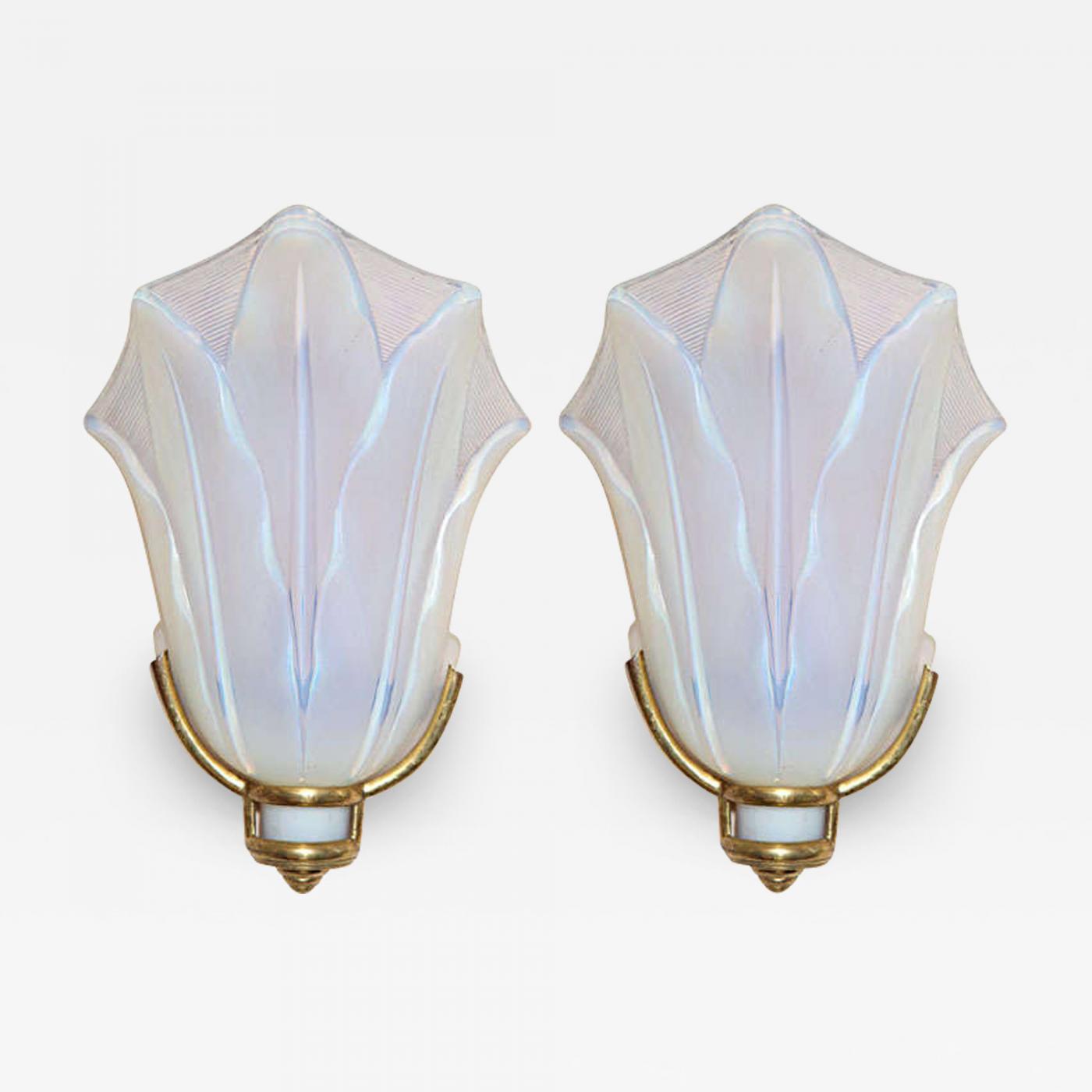 EZAN Pair of Art Deco Wall Sconces in opalescent glass shades mounted in a bronze frame.