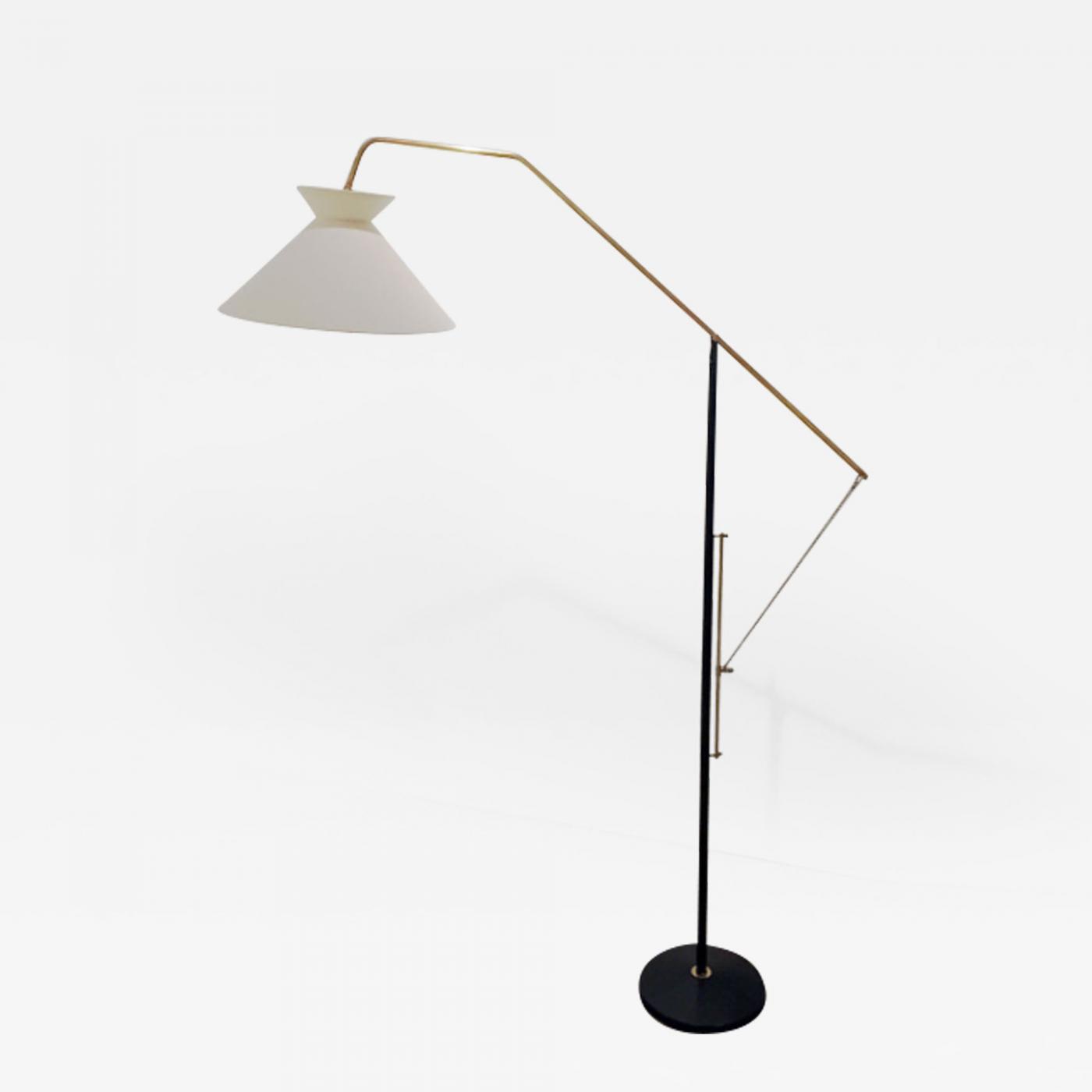 This elegant and rare floor by has a wonderful system to articulate the lamp. The chain allows you to raise and lower the head of the lamp. A swivel at the cotton lampshade lets you direct the light at a perfect angle. Lamp has the original French bayonet socket, with an adapter provided for a standard bulb. Max wattage 60 watts. Lamp is in our showroom in the New York Design Center in NYC.