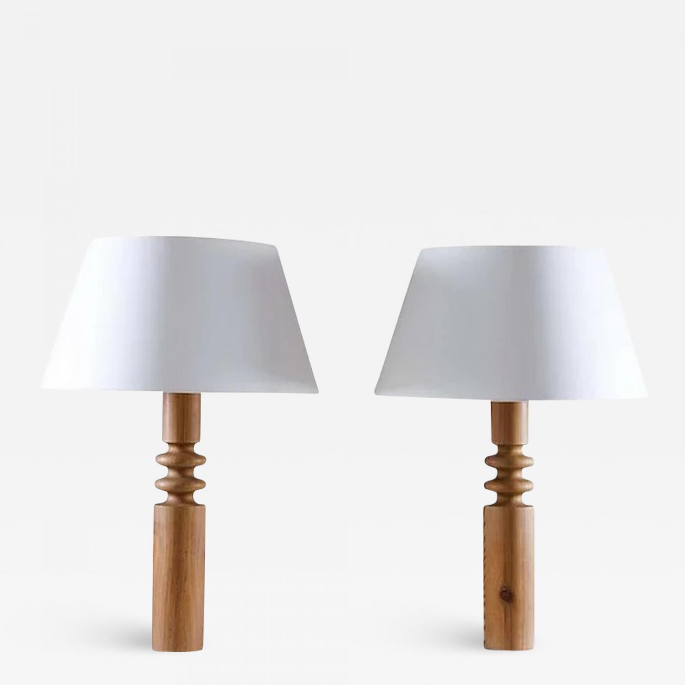 Set of two large table lamps by Östen Kristiansson for Luxus, Sweden, 1970s. The lamps consist of a base of turned pine, that have aged beautifully. The lamps come with new high-quality shades in off-white satin fabric.