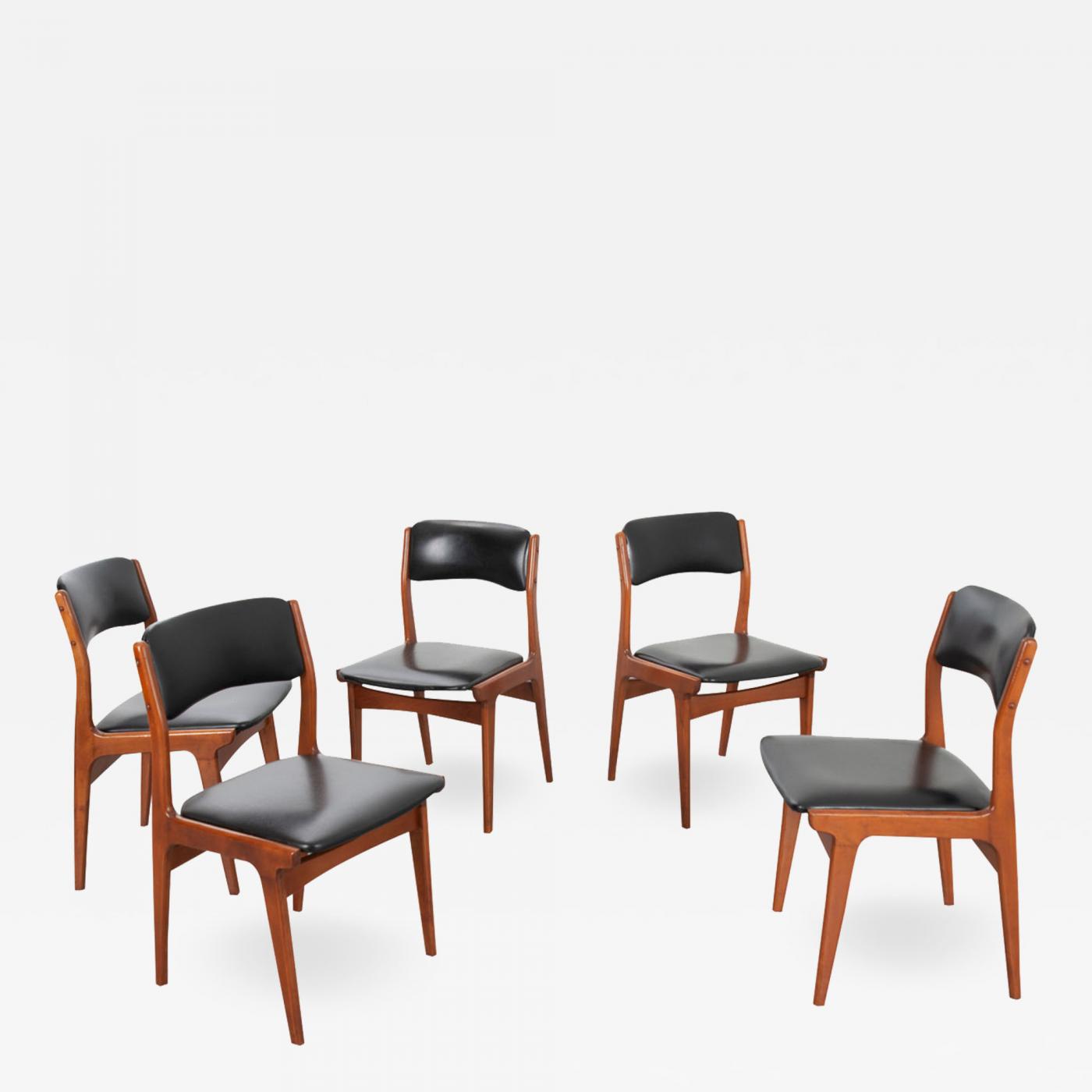 Excellent set of five Scandanavian design dining chairs. Made of teak wood with black vinyl seat cushions and backrests. Seats: 17-⅞”H. See detailed pictures for condition.