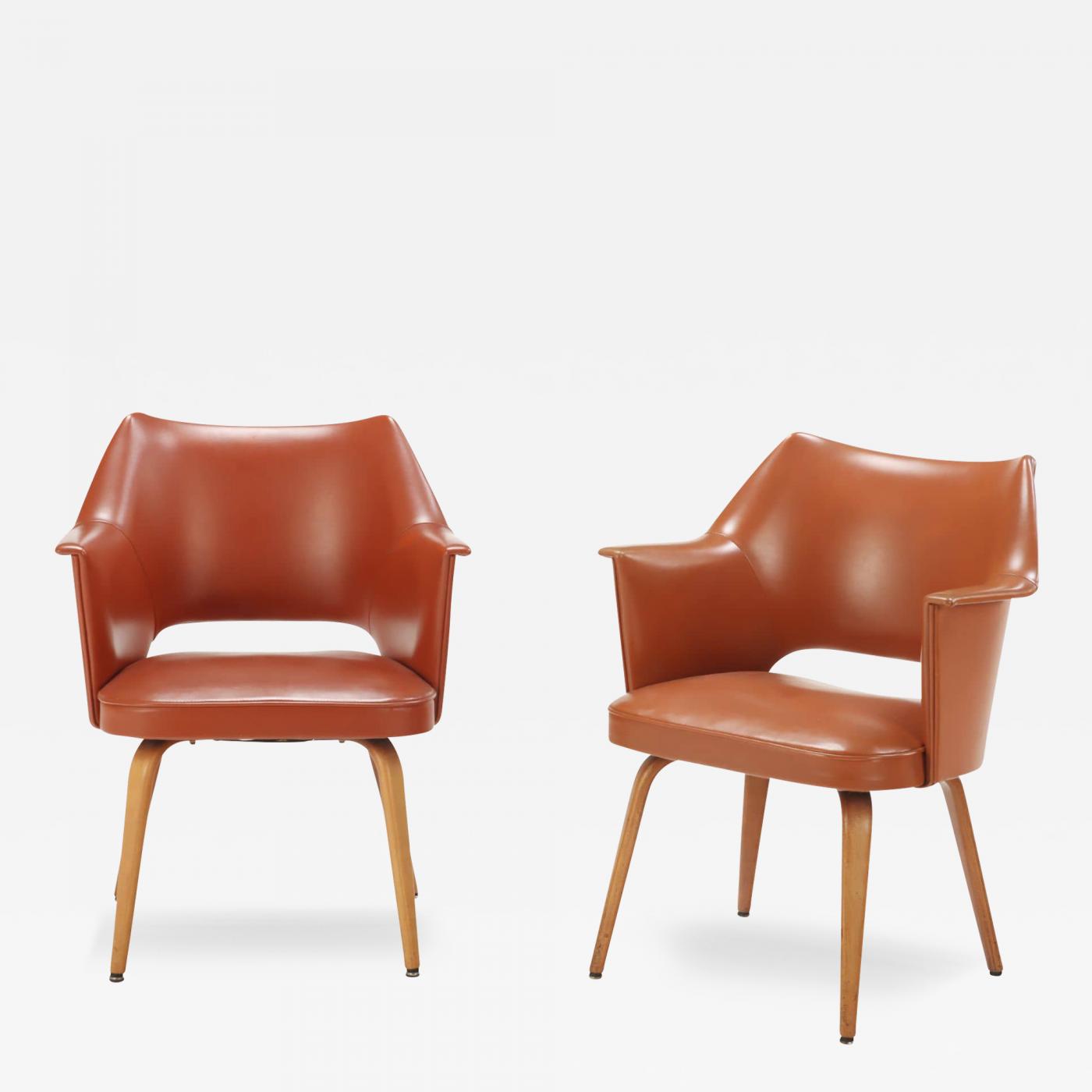 A pair of mid century modern labeled Thonet leather chairs having continuous arms.