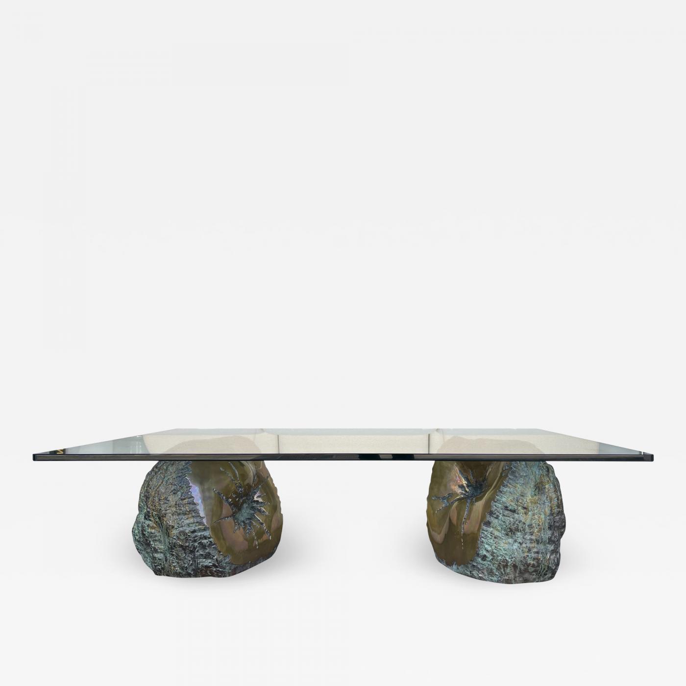 Bronze rock sculpture coffee low or cocktail table attributed to the french artist Anita Tullio, massive thick glass top. Foundry stamp mark. In the mood of Fred Brouard, Maison Charles, Jansen, Luciano Frigerio, Willy Daro, Agostini, Duval Brasseur, Philippe Jean, Victor Roman.