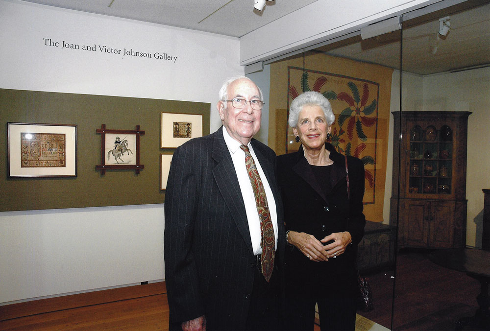 The Johnsons have long been supporters of the arts, a dedication that began more than fifty years ago. “When we were first married,” notes Joan, “we knew nothing about antiques. Our first home was a wonderful old farmhouse that I planned to renovate and update to incorporate our Nakashima and Danish Modern furniture. Two friends who had just graduated from the first Winterthur program convinced me to visit Mr. du Pont and see his museum before I did anything. That experience,” she says, “along with living in the old house itself, changed my life, and from that point on I was hooked.” Victor has been an enthusiastic partner, and through the years the couple has focused their collection on Pennsylvania-German folk art and furnishings; their 230-piece fraktur collection is a promised gift to the Philadelphia Museum of Art and was recently featured in a remarkable exhibition and catalogue, Drawn with Spirit: Pennsylvania German Fraktur from the Joan and Victor Johnson Collection.