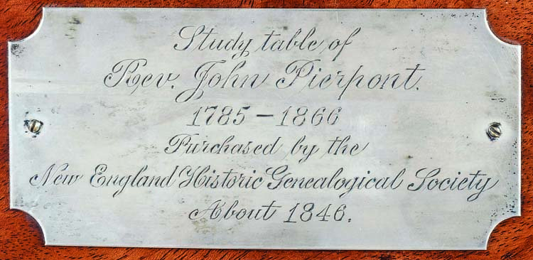The table is one of the earliest acquisitions made by NEHGS, having been purchased at auction in 1846 by one of the society’s founders, S. G. Drake, for the organization’s first headquarters near City Hall, off Court Square in Boston. Rev. John Pierpont, the maternal grandfather of New York banker J. Pierpont Morgan, was minister of Boston’s Hollis Street Church from 1819 to 1845. Born in Litchfield, Connecticut, Pierpont graduated from Yale College in 1804 and practiced law until taking a degree from Harvard Divinity School. Following his tenure at Hollis Street Church, Pierpont served as minister of the United Church in Medford until retirement in 1854.