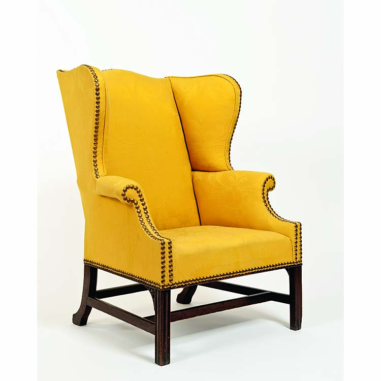 Described by a nineteenth-century occupant of the house built for Boston merchant Thomas Hancock (1703–1764) as being among those pieces of furniture “covered with a rich damask,” NEHGS’ Hancock chair was part of an ensemble of six on view at the society’s former Somerset Street headquarters. Each of the chairs was owned by a governor of a New England state, and the Hancock chair—representing Massachusetts—is the only one remaining of that collection. Built in 1735, the Hancock house stood alone atop Beacon Hill for thirty years. Hancock’s wife, Lydia Henchman (1717–1776), inherited the house and willed it to her nephew, John Hancock (1737–1793). The famous signer of the Declaration of Independence lived there until his death. The house was torn down in 1863 to make room for a new wing for the Massachusetts State House.