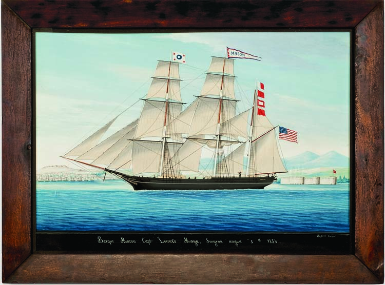 Rafaelo Corzini was the preeminent pier-head painter in Smyrna from the 1820s to the 1850s. The 325-ton Macon was built in the Ferry Village section of what is now South Portland, Maine, in 1853. The house flag on the ship is that of Israel Lombard & Co. of Boston, presumably the Macon’s home port. Having been painted in Smyrna one year after its construction, the Macon was probably engaged in the China trade and in port to load opium. British traders did not permit American ships involved in the China trade access to the port of Calcutta, which they controlled. Hence, the Macon was taking on cargo in Smyrna. Nothing is known of the ship’s master, Lorenzo Maya, and the Macon’s ultimate fate is unknown as the ship is not mentioned in the 1857 edition of Lloyd’s Register.