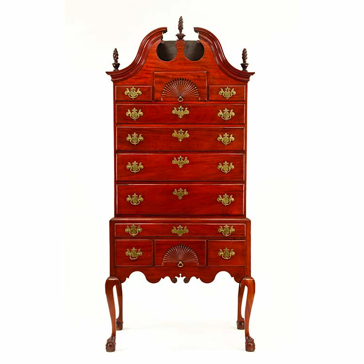 Elijah Sanderson was born in Watertown, Massachusetts, but had moved to Salem by 1779. By 1800 he and his brother Jacob (1757–1810) owned the largest of Salem’s cabinet-making establishments located on Federal Street in what is now the McIntire Historic District. Elijah was one of the founders of the Salem Cabinet-Maker Society; furniture produced by members was shipped on consignment to the southern states, West Indies, South America, Africa, and India. This elegant high chest features a number of recognizable features associated with finer examples of Salem furniture including “creased” knees and an undulating skirt with central pierced diamond and pinwheel rosettes.