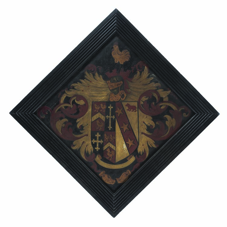 This early example of heraldic funereal art was painted after the death of Thomas Gookin (1614–1690) and likely hung in the church of the manor of Ripple Court, near Dover, in Kent, England. The Gookin hatchment features the family’s coat of arms—a chevron and roosters—quartered with the arms of the Durrant family—the family of Thomas Gookin’s grandmother. The Gookin and Durrant arms are impaled with stars and a bear, the arms of Gookin’s wife, Jane Edolph (1616–1690). The hatchment’s black background indicates that Jane predeceased her husband (by five days). Had she been living, the right-hand side of the hatchment’s background would have been painted white or left as natural wood.