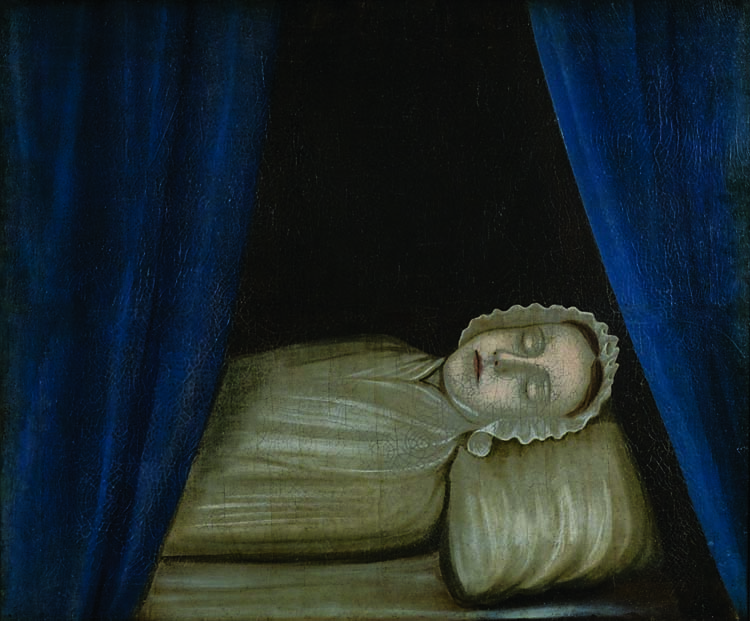 Elizabeth Royall (1740–1747) was born in Medford, Massachusetts, the daughter of the wealthy Loyalist merchant Isaac Royall (1719–1781) and his wife, Elizabeth McIntosh (1722–1770). An early posthumous portrait, it was undoubtedly painted as a memorial of the couple’s young daughter, lying on her death bed. Until 1989 the portrait was mounted on the obverse of the same stretcher holding the portrait of her younger sister, Mary McIntosh Royall. The artist, Joseph Badger, was born to a family of modest means in Cambridge, Massachusetts. He was a glazier, house and sign painter, and a self-taught portraitist. Badger’s career flourished in the 1740s and 1750s, but was eclipsed in the 1760s by the emergence of the eminently talented Boston artist John Singleton Copley. When Badger died his wife was required to sell their modest house to pay his debts.