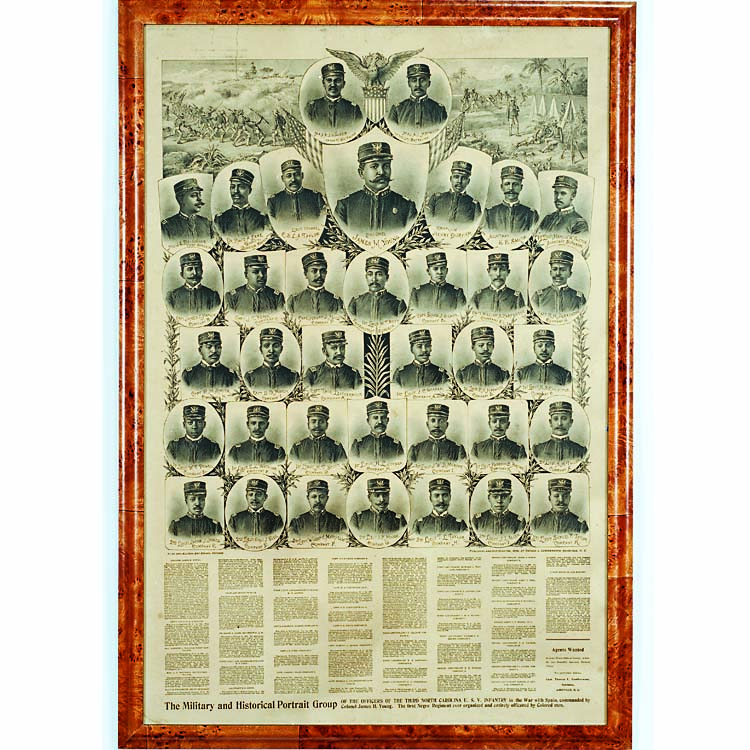 This broadside features the portraits of the officers of the Third Carolina Volunteers commanded by Col. James H. Young together with a biographical sketch of each officer and a short history of the regiment. James H. Young (1860–1921) was an African-American politician in North Carolina. Educated at Shaw University, Young was appointed colonel of the all black volunteer regiment organized to fight in the Spanish-American War. Although the unit did not see action, Young was believed to be the first African-American to hold the rank of colonel in the United States Army. Following the war, he received a federal appointment from President William McKinley and served as deputy revenue collector for Raleigh, North Carolina.