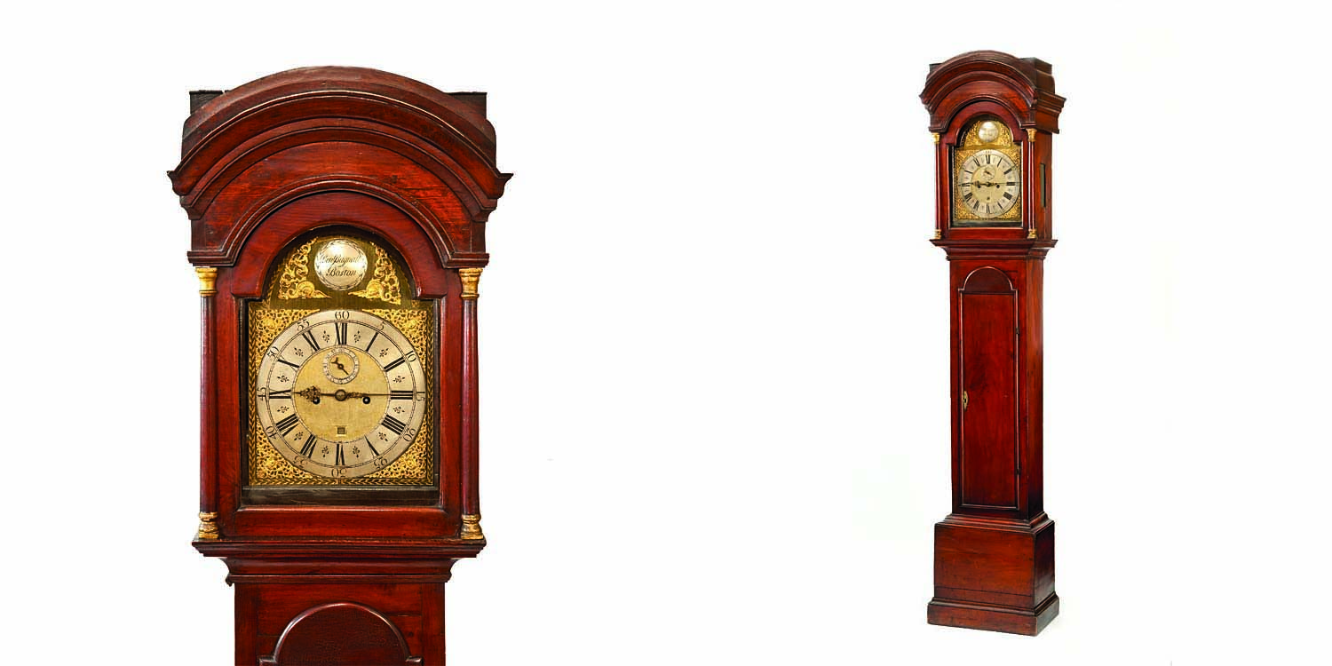 The manufacture of clocks in America began in the first years of the eighteenth century. Among the earliest recorded New England clockmakers was Benjamin Bagnall, who apprenticed as a watch and clockmaker in England before settling in Boston in around 1712. In the records of the selectmen of the town, August 13, 1717, the following is written: “that Joseph Wadsworth, William Welstead, Esq., and Habijah Savage, Esq. be desired to treat with Mr. Benjamin Bagnall about making a Town Clock.” The first documented domestic Bagnall clock was a pendulum model, made in 1722.1 On the inside of the lower door was written: “This clock put up January 1o, 1722.” Enclosed in a tall case of solid black walnut, a wood used in the earliest American-made cases, the clock is similar to the one owned by NEHGS. Benjamin Bagnall married Elizabeth Shove (born at Charlestown, Massachusetts, ca. 1696). Among their children were two sons, Benjamin Jr. and Samuel, who were also clockmakers.