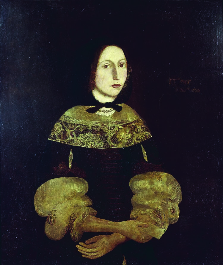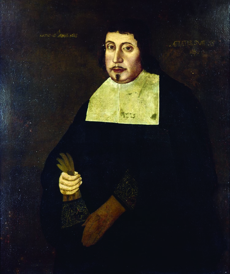Edward Rawson was born in Gillingham, Dorsetshire, England, April 16, 1615, and came to Newbury, Massachusetts, in 1636 or 1637. He married Rachel Perne (d. 1677), daughter of Richard Perne (1583–1636), fathered twelve children, and moved to Boston, living on “Rawson’s Lane,” now Bromfield Street. From 1650 to 1686 he served as third Secretary of the Massachusetts Bay Colony. An anonymous Boston artist, the Freake Painter (so-called because two of his paintings were of members of the Freake family) produced ten oil-on-canvas paintings of prominent Bostonians between 1670 and 1680. He is thought to be an English immigrant who painted in the Elizabethan-Jacobean style, emphasizing linear depiction of forms and surface ornamentation. The works of the Freake painter are considered seminal in the history of American folk painting. Another NEHGS portrait, of Edward Rawson’s ill-fated daughter, Rebecca (show inset), is also attributed to the Freake painter.