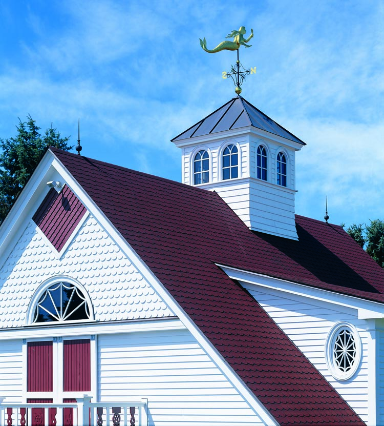 It took three men to install the gilded copper mermaid weathervane that recently took her place on top of the barn’s cupola. Mermaids are nearly everywhere in the Glazer home: beckoning visitors to turn into Mermaid Lane, the couple’s name for their private drive; tucked into mullions; suspended from ceilings; and popped into ice-cold drinks as swizzle sticks.