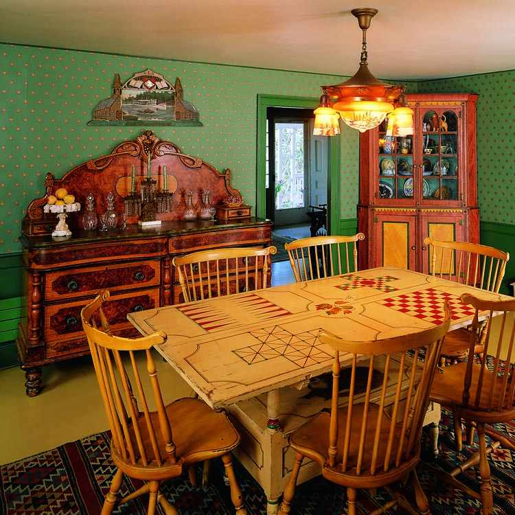 The Barnes Foundation was a transforming experience for both husband and wife. Barnes’ intuitive approach to looking at art and his eclectic juxtaposition of objects based on subtle, visual harmonies inspired Nancy, who exercises similar artistry in her own imaginative arrangements and provocative color combinations. These qualities distinguish the Glazers’ private living quarters as well as their public displays at the Philadelphia Antiques Show and the Winter Antiques Show in New York, where the Glazers first exhibited in 1977. It was at Ker-Feal, Barnes’ eighteenth-century farmhouse in Chester County, Pennsylvania, that Jim and Nancy first fell in love with Pennsylvania folk art, which combines earthy practicality with an irrepressible joie de vivre. The Glazers’ collecting odyssey began after they purchased their first home, a five-story Philadelphia townhouse, in 1969.