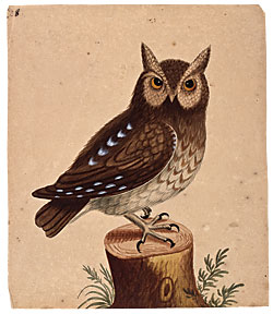 George Edwards (English, 1694–1773), drawing of a little owl, ca. 1733. Watercolor and ink on laid paper, 10-1/4 x 8-3/4 inches. Inscribed upper left: 8. Courtesy, Drayton Hall, a historic site of the National Trust for Historic Preservation.