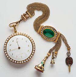 Jean Antoine Lépine (French, 1720–1814), Macaroni with watch, Paris, France, 1797. Gold, pearls, enamel, agate and carnelian; steel, brass. L. 9-1/16 in. Courtesy, The Charleston Museum, Charleston, S.C., HQ 0184, 1946.086. Photography by Kevin Bourque.