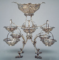 In May 1768, Arthur Middleton and his wife Mary Izard Middleton sailed abroad on a three year grand tour of Europe. When they returned to Charleston, they brought with them goods purchased during their travels, including over forty pieces of elegant plate. Among the silver was this outstanding epergne, with eight hanging baskets, all engraved with the Middleton coat of arms. The vast majority of Author and Mary Middleton’s eighteenth-century silver has remained in the family, and most of it is currently exhibited in the house museum at Middleton Place.