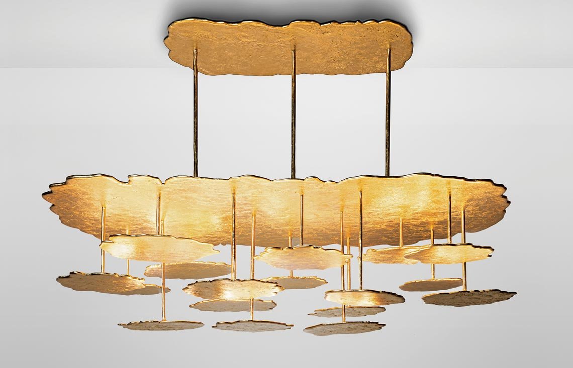 Top designers agree. "There is a celestial quality to Hélène's work that feels to me so inspired,” AD100 designer Kelly Behun remarks. Recently, Behun commissioned one of Saint Lager’s Moon Gold Nuages chandeliers, made out of poured aluminum with a gold leaf finish that, Behun says, “does the most magical things in the room, especially as the changing light plays upon it. It feels like the ceiling has cracked open to the sky above and the loveliest cumulus clouds are floating by.” Nature is her biggest inspiration, Saint Lager says, the place from which she draws ideas. But she doesn't replicate what she sees: "Everything is done with intuition. What emerges is unconscious," she explains, though what results often seems to reflect the random, fluid forms or processes of natural phenomena: fossilization of rocks, atmospherics, or the labyrinthine intricacy of the cosmos and its otherworldly beauty.