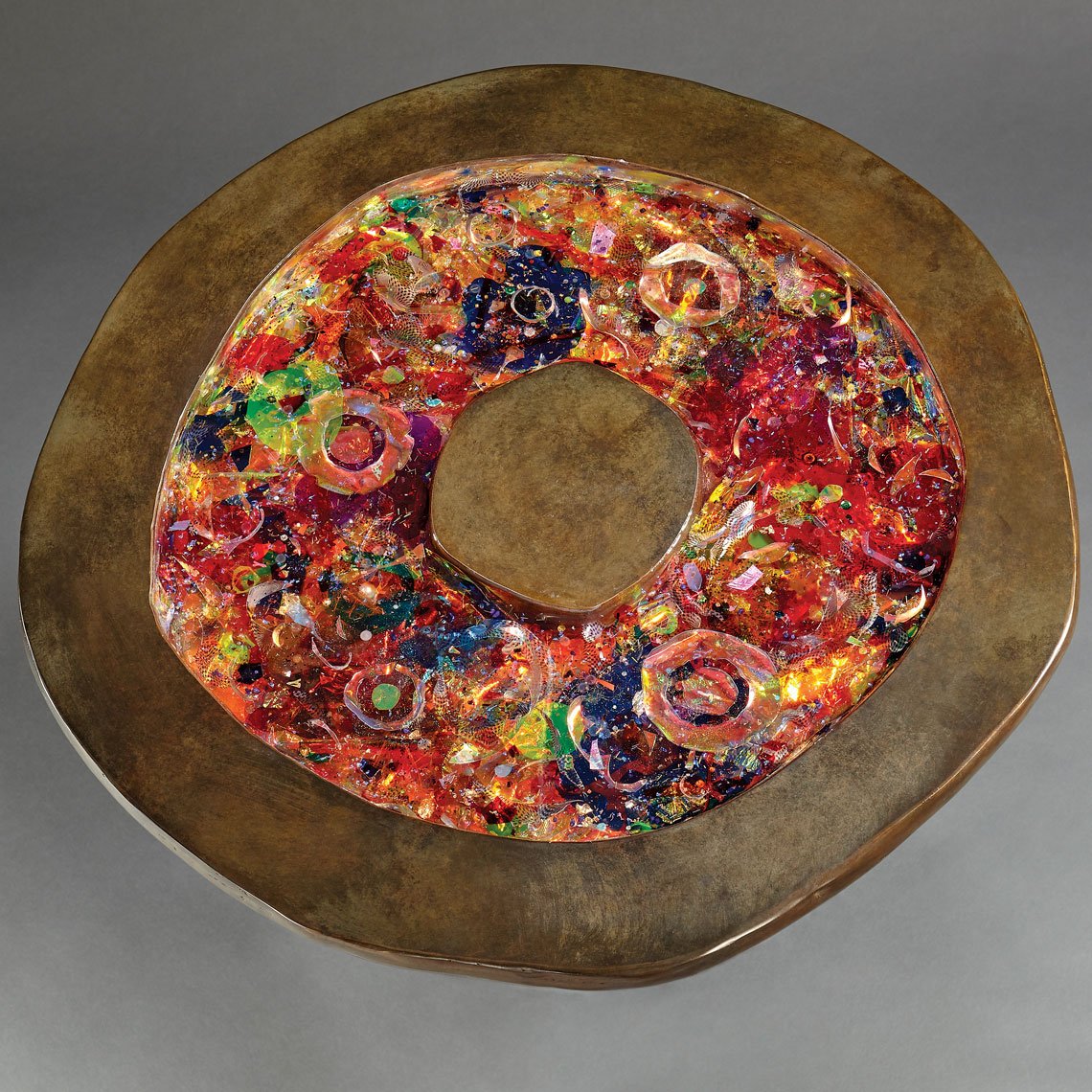 | Left: Tokyo Fleurs Table, multicolored resin inclusions, steel with gold leaf finish. Signed and dated, 2023. Right: Detail, Tokyo Fleurs Table. | ||