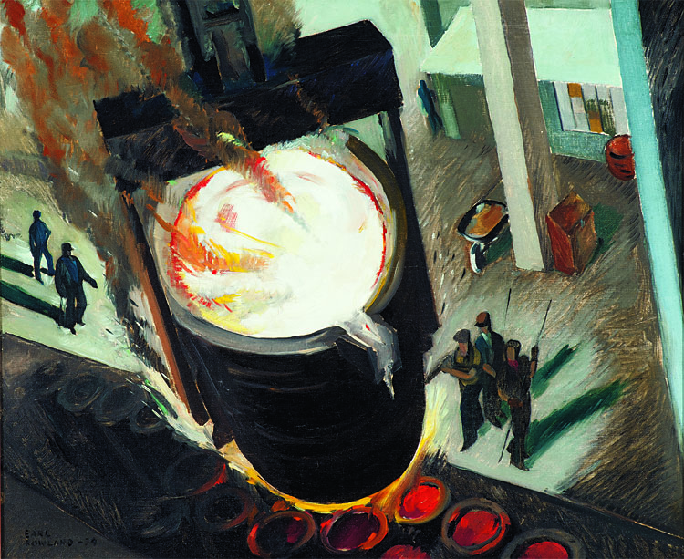 After serving in the U.S. Army during World War I, Earl Rowland returned to Los Angeles and established himself in the local art scene until 1930. Rowland then moved north to Stockton, California, to accept a teaching position at the College of the Pacific. In 1937, he became director of Stockton’s Pioneer and Haggin Art Gallery (now the Haggin Museum), a position he would hold for more than twenty-five years. Stockton’s busy inland port attracted a number of industries, including ironworks. Rowland’s The Smelters is a bold, plunging view—and a powerful image of American industry. A bucket of molten iron, white hot and expelling noxious smoke, is transported overhead from the blast furnace to the molds. Below, workers alive to the dangers look up and track the bucket’s movement. Enormously disproportionate to the size of the workers, the bucket in The Smelters would seem to inspire awe, not indifference, over the men who operate it.