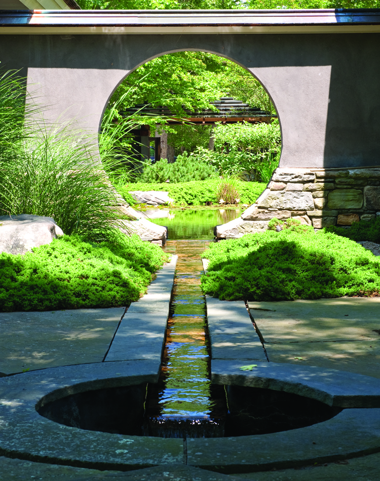 One of the reasons the couple was drawn to Isleib was his integration of an Asian aesthetic into his designs. The inspiration he has gained from travels to locations such as Japan, Bali, and Bangkok is evident in his work, as is the architecture of Frank Lloyd Wright and I. M. Pei. When creating the landscape for this property, Isleib and the homeowners worked with Zen Associates of Massachusetts. The firm implemented their conceptualization of the Asian-style gardens and the pools and waterways that weave around the house. The large circular “window” that creates a visual screen on one edge of the koi pond was inspired by John D. Rockefeller’s garden on Mount Desert Island. Says Isleib, “I love outdoor spaces that become enclosed architecture.” The converse of this concept is seen indoors, most strikingly in the living room, where the eight-foot high panes of glass disappear into the walls with no corner element, so that the outside and inside worlds appear as one. Says the wife, “Part of the interior decoration is the outside and how it flows within.”