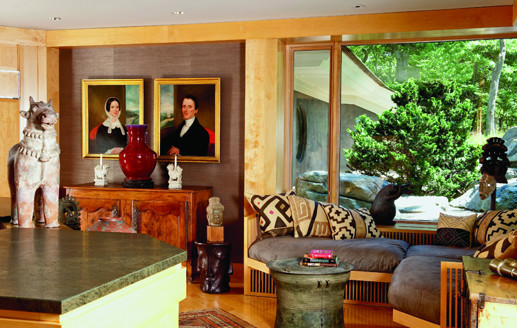 - These two portraits of a husband and wife, circa 1840 and by an unknown artist, were purchased in Litchfield, Connecticut, by the couple about twenty-five years ago, and are one of the few things they retained from their first house. They are placed above a French commode from the early 1800s. A Chinese sang de boeuf vase is centered by a pair of Foo dog candlesticks. Also in the room are an antique Thai bronze rain drum, a Korean Tong Tsui dowry chest, and a tomb pottery bull from Rajasthan. The sofa, designed by Jonathan Isleib, is accented with African tribal-made pillows of natural grass fabric.