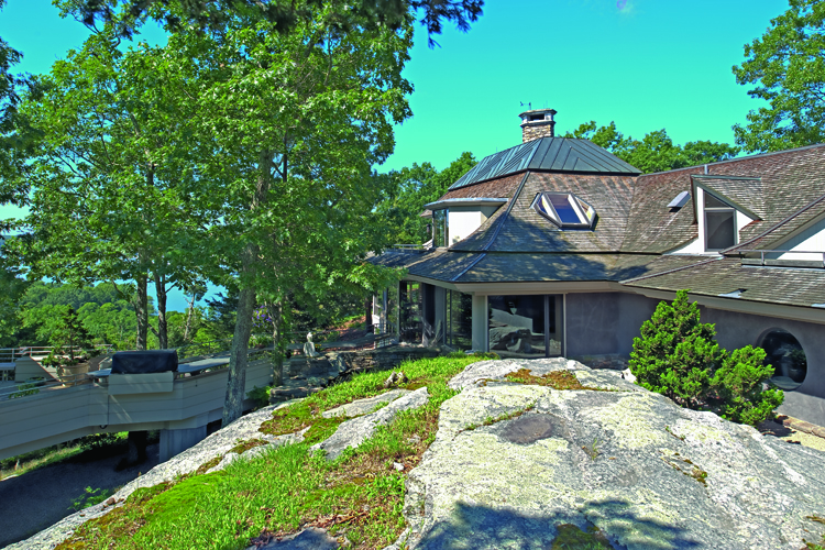 Before any building began, they had had an extensive topographical survey made, their intention being to design the house without disturbing the established trees on the property. This symbiotic relationship with the environment is one of Isleib’s specialties. Siting of the house involved substantial blasting of bedrock—which took six months to complete—so that the house appears to be sprouting from the side of the hill. Large exposed stones in the lawn complement those used in the patio and elsewhere around the house. Five types of stone were used for the courtyard to provide a natural, varied appearance. The natural color of the house’s stucco blends with the bark of the surrounding trees. All this attention to detail was worth the wait: the couple gained the privacy they wanted, and the completed house blends with the landscape and is hidden from view.