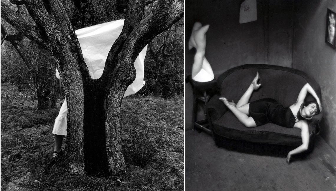 Left: Francesca Woodman PE/FW, “George and Betty Woodman,” n.d. Gelatin silver print 8 x 10 in. Right: André Kertész, “Satiric Dancer,” 1926. Gelatin silver print, 9 x 7 in. |