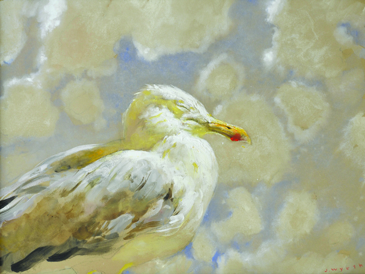 Animals were the subject of some of Jamie’s earliest paintings, and he has returned again and again to painting them. To paint animals Jamie has pursued a process very close to the “method acting” he employs with his human subjects. He has lived intimately with animals, keeping a wolf in his living room, studying sharks in a specially constructed tank, working in a studio in his barn with raccoons scrambling on the ceiling over his head. Many of his most remarkable paintings have portrayed birds, such as ravens and seagulls, focusing on their savagery as well as their beauty.