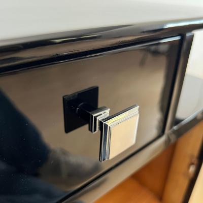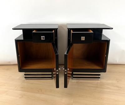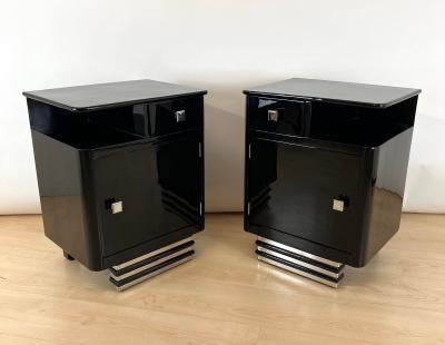 Pair of Art Deco Bedside Cabinets, Black Lacquer, Chrome, France circa 1930