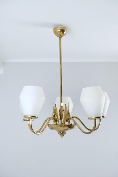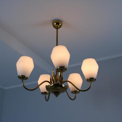 Exceptional Scandinavian Brass & Opal Glass Chandelier or Ceiling Lamp 1950s