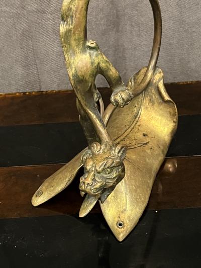 Mysterious Art Nouveau Bronze Dragonesque Panther Lamp with Nautilus Shell Shade