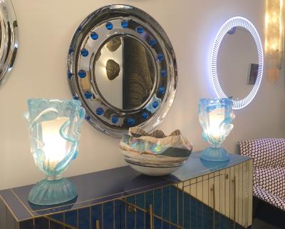 Italian Modern Nickel Round Mirror with Jewel like Blue Murano Glass Rocks