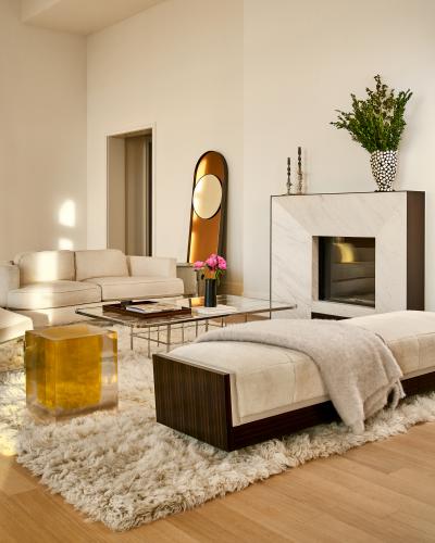 Custom Modern Natural Oak Bench with White Boucle by Carrocel