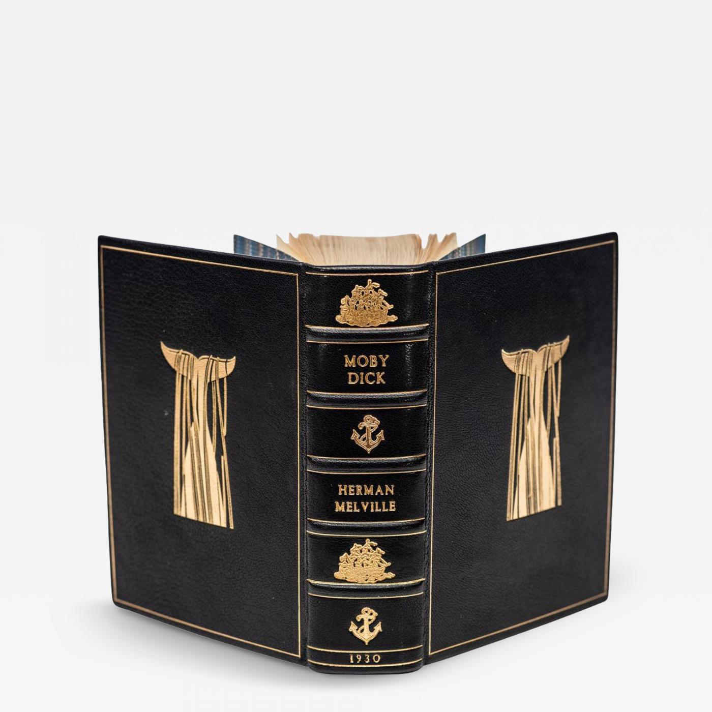 1 vol. Herman Melville, Moby Dick or The Whale. First Trade Edition, Limited Edition. Illustrated by Rockwell Kent. Illustrated throughout. Inscribed to Nathaniel Hawthorne. Rebound in full midnight blue Morocco leather. Gilt inscribed whale's tail tangled in rope on front and back covers. Raise bands. All edges gilt. Gilt ship anchors, boats, and sailboats on spine panels. Published: New York; Random house; 1930