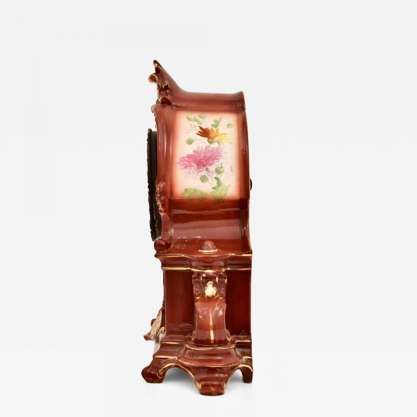 A superb late-19th century porcelain mantel clock, titled “La Manche”, created by the renowned Ansonia Clock Company in collaboration with Royal Bonn of Germany—famed for their exquisite hand-painted porcelain work.
