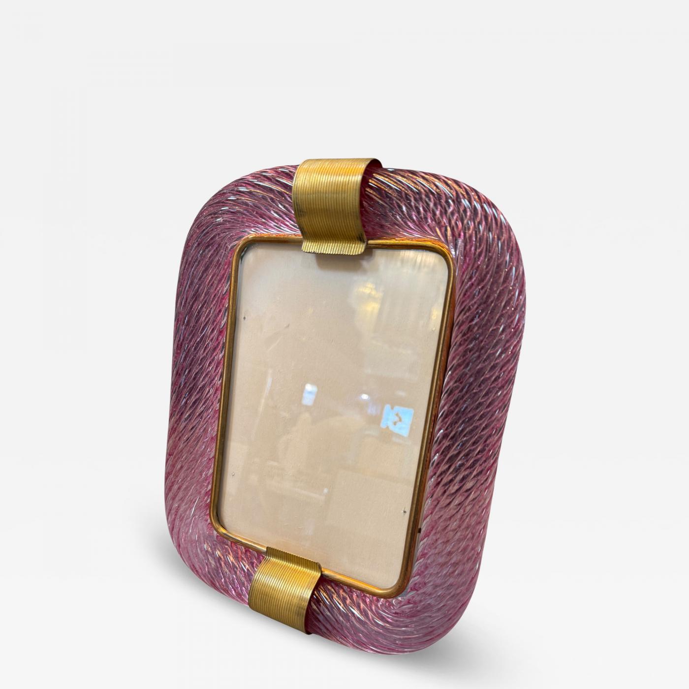 A sophisticated mid-20th century Italian picture frame, crafted in Murano with exceptional glassmaking artistry. The frame displays a radiant pink hue, enriched with a twisted, textured surface that shimmers with depth and dimension when it catches the light. Its rounded rectangular profile is elegantly accented with ribbed brass clasps at the top and bottom, creating a striking dialogue between warm metal and vibrant glass. This frame serves as both a functional holder for cherished photographs and a decorative accent piece, embodying the elegance and craftsmanship of Italian mid-century design. A rare and refined decorative object, ideal for collectors of Murano glass and lovers of timeless Italian style.