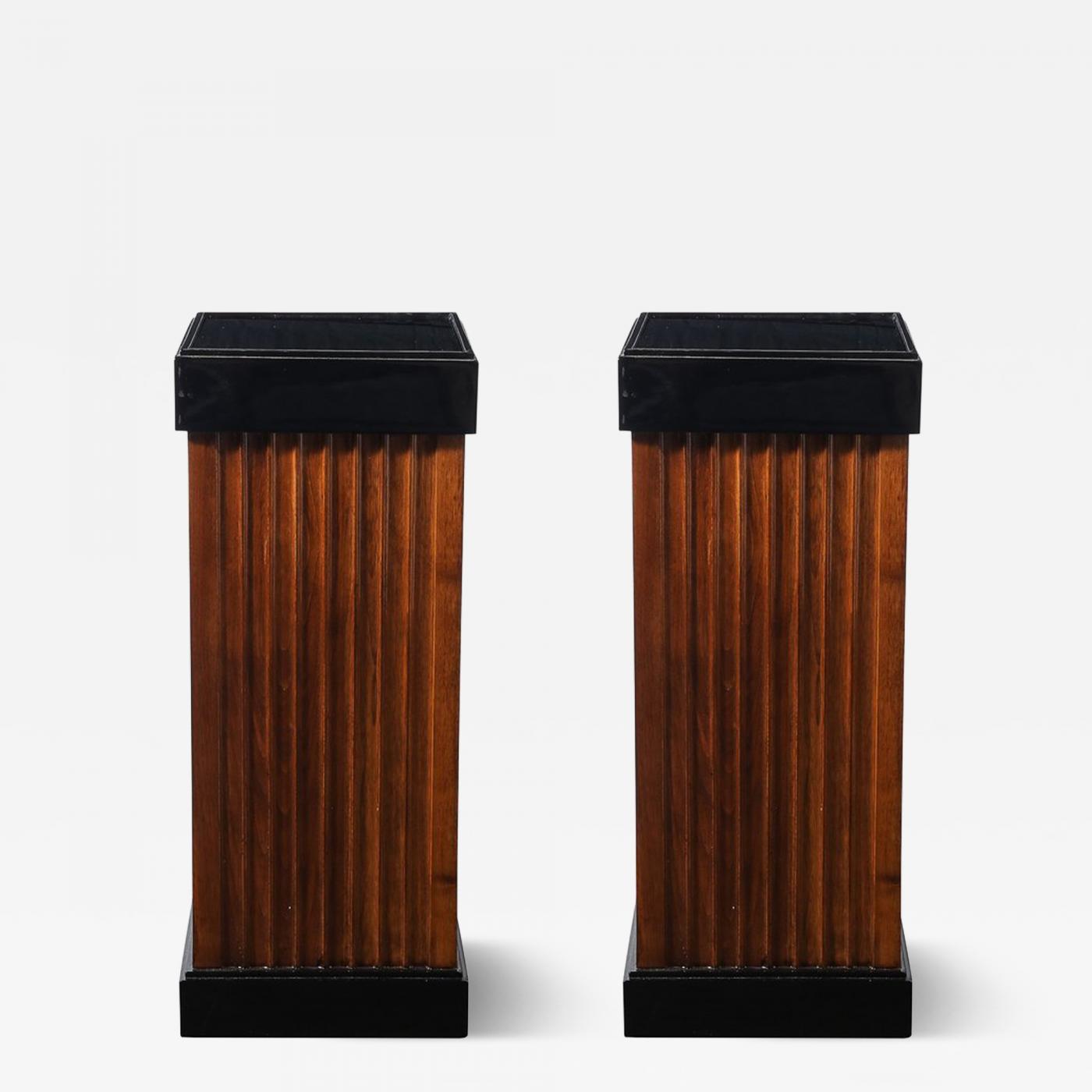Pair of Art Deco Pedestals in Fluted Walnut & Black Lacquer Bases w/ Glass Tops