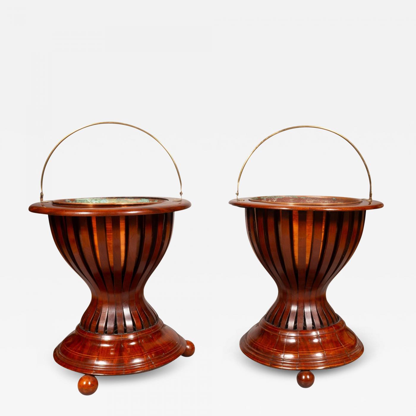 Each with brass liners and brass bail handles. Urn shaped with open slat work and circular base with ball feet.