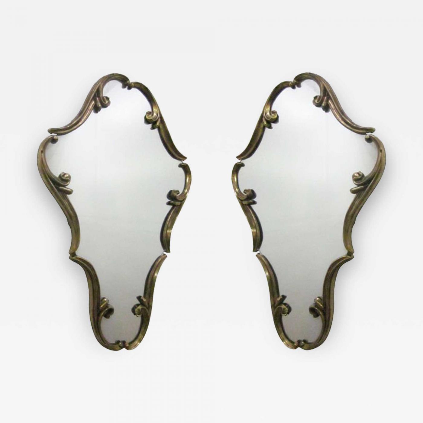 Pair of Directoire style French mirrors. Mirrors have a decorative metal frame with a gold painted finish. Back of the mirrors is wood.