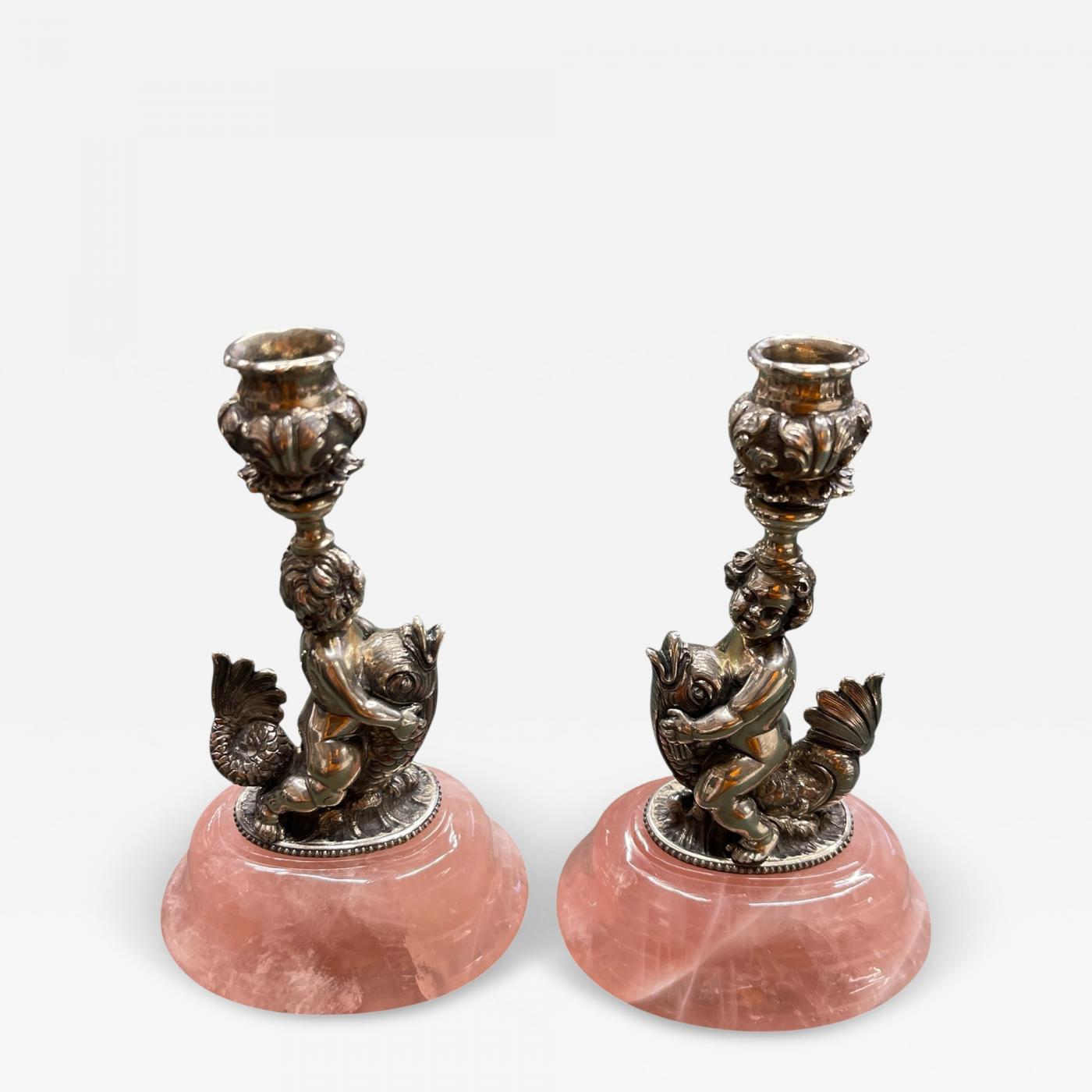 1970's Silvered bronze and pink quartz candle holder in the style of Buccelatti